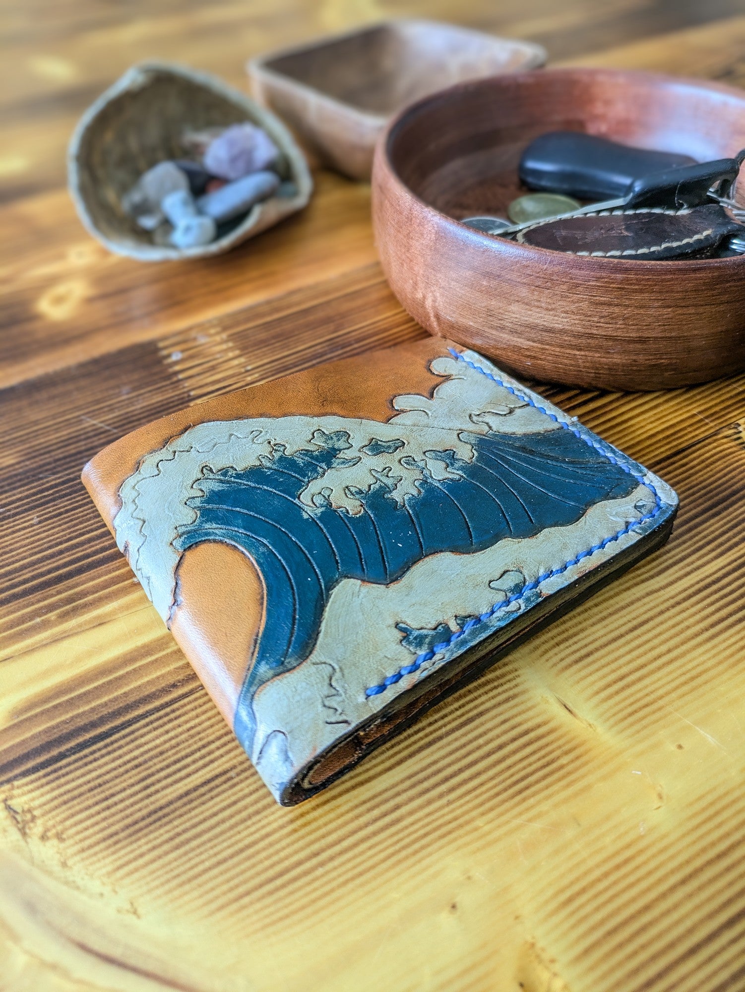 The Ocean and Waves Bifold wallet is a timeless and elegant vegetable-tanned leather wallet. It features an artwork on the front entirely hand-carved and painted by our leatherworker, based on Japanese artworks of the ocean and the rising sun. This is more than a wallet, it’s a work of art that reflects your individuality.