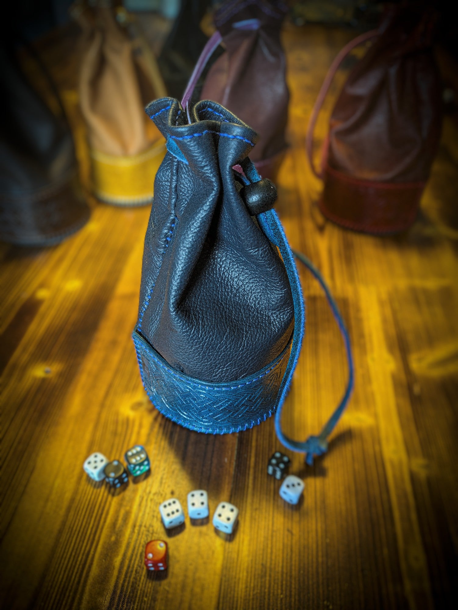Looking for a unique and high-quality gift for the table-top gamer in your life? Our dice bags are a practical and useful accessory that feels great to use and looks perfect on the board. They are an excellent companion for your DnD or Warhammer adventures, whether you need to carry your dice or shake things up before an important throw! These bags are all hand-made by our Noble Mouse Leatherworker, from the cutting to the sewing and carving.