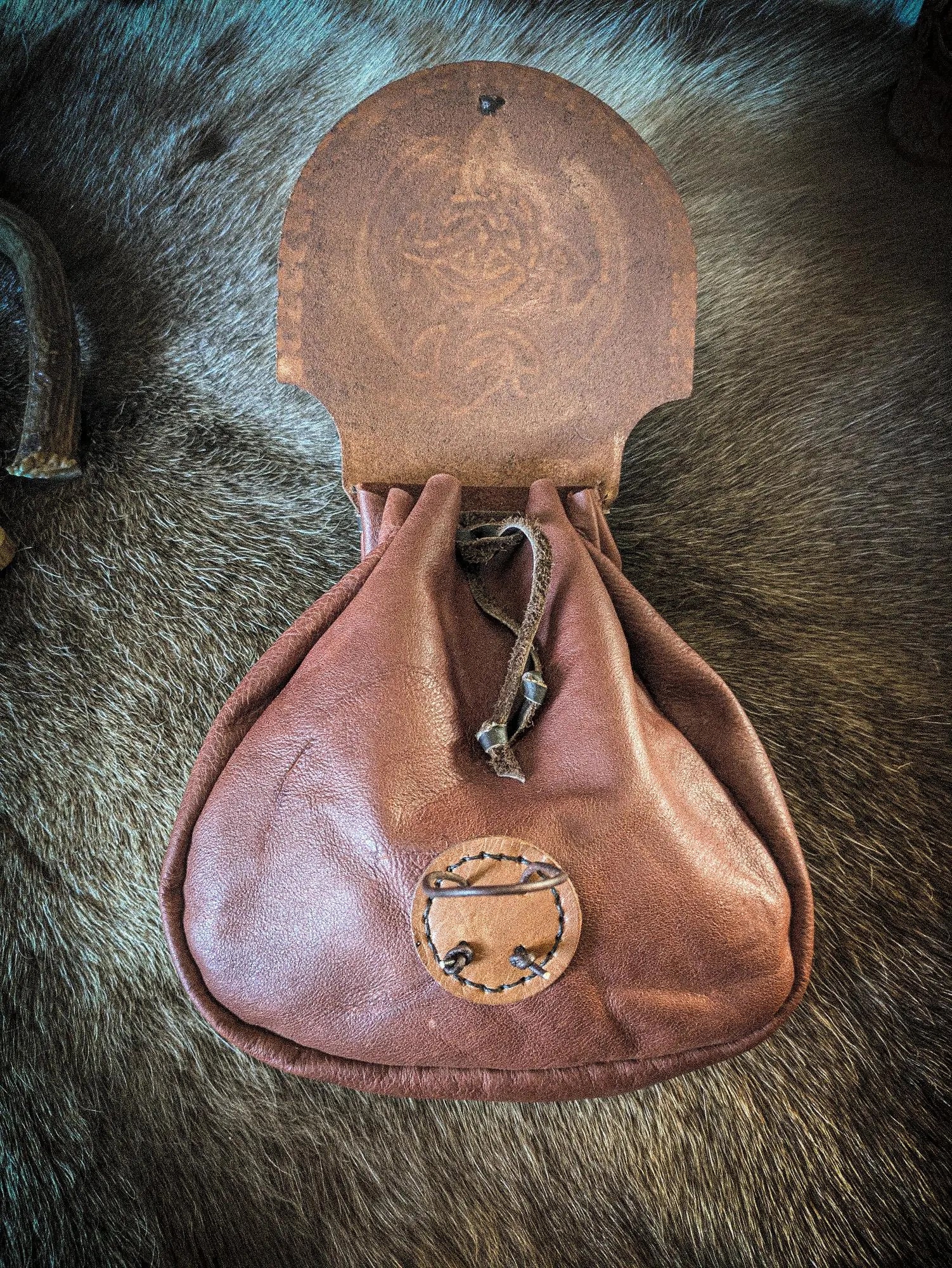 The body of the bag is made of of a red-dyed garment leather, which is locally sourced. The lid of the bag is made from sturdy and reliable vegetable-tanned cow leather, treated and preserved with neatsfoot oil to keep it moisturized. The lid clasps shut with a real deer antler tip.