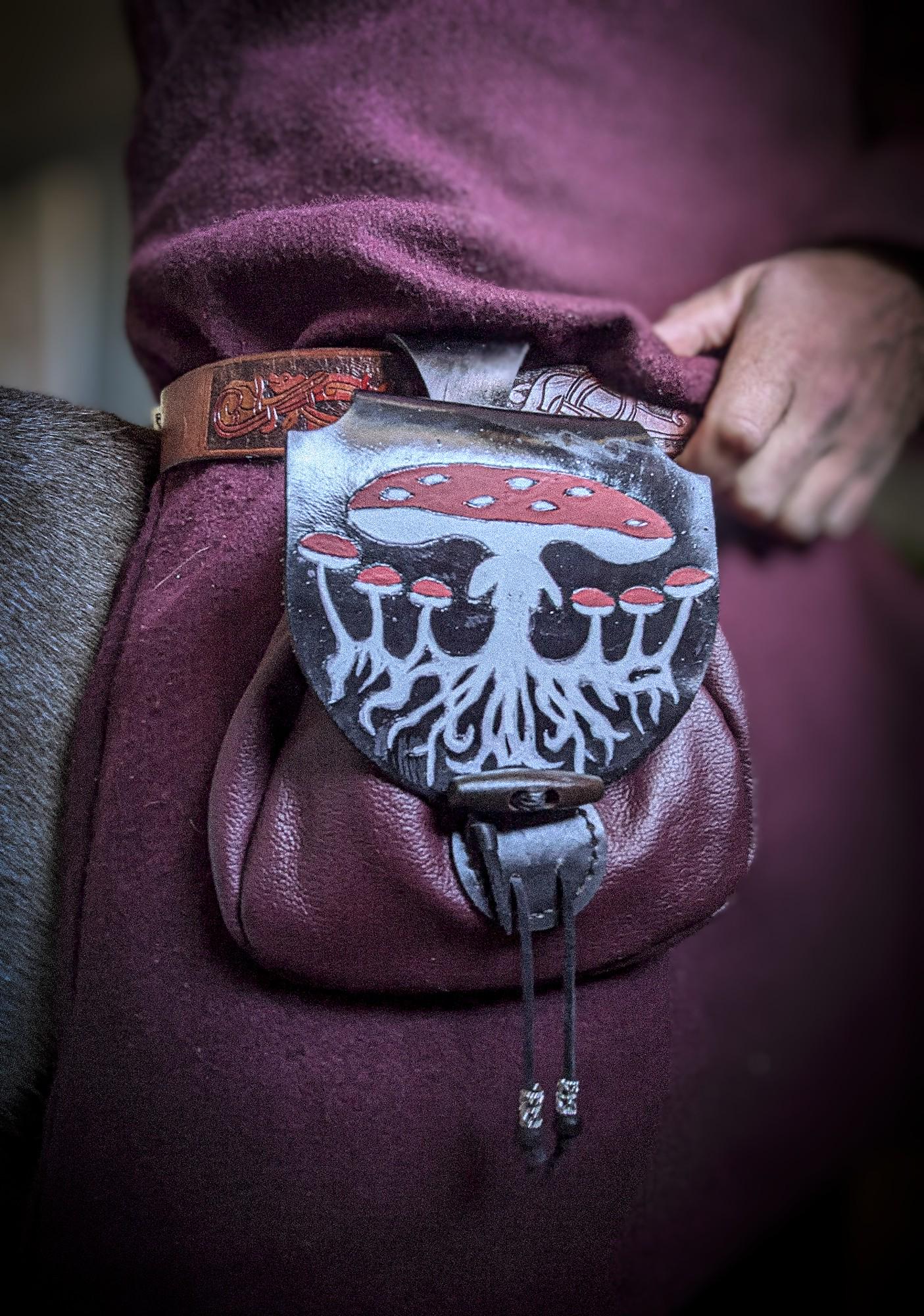 The Mycelium Mushroom Leather Belt Bag is the perfect companion for any witch's outfit! It is completely handcrafted: The lid of the bag is made from sturdy and reliable vegetable-tanned cow leather, treated and preserved with neatsfoot oil to keep it moisturized. The body of the bag is made from a black-dyed garment leather. The bag clasps shut using a large wooden toggle