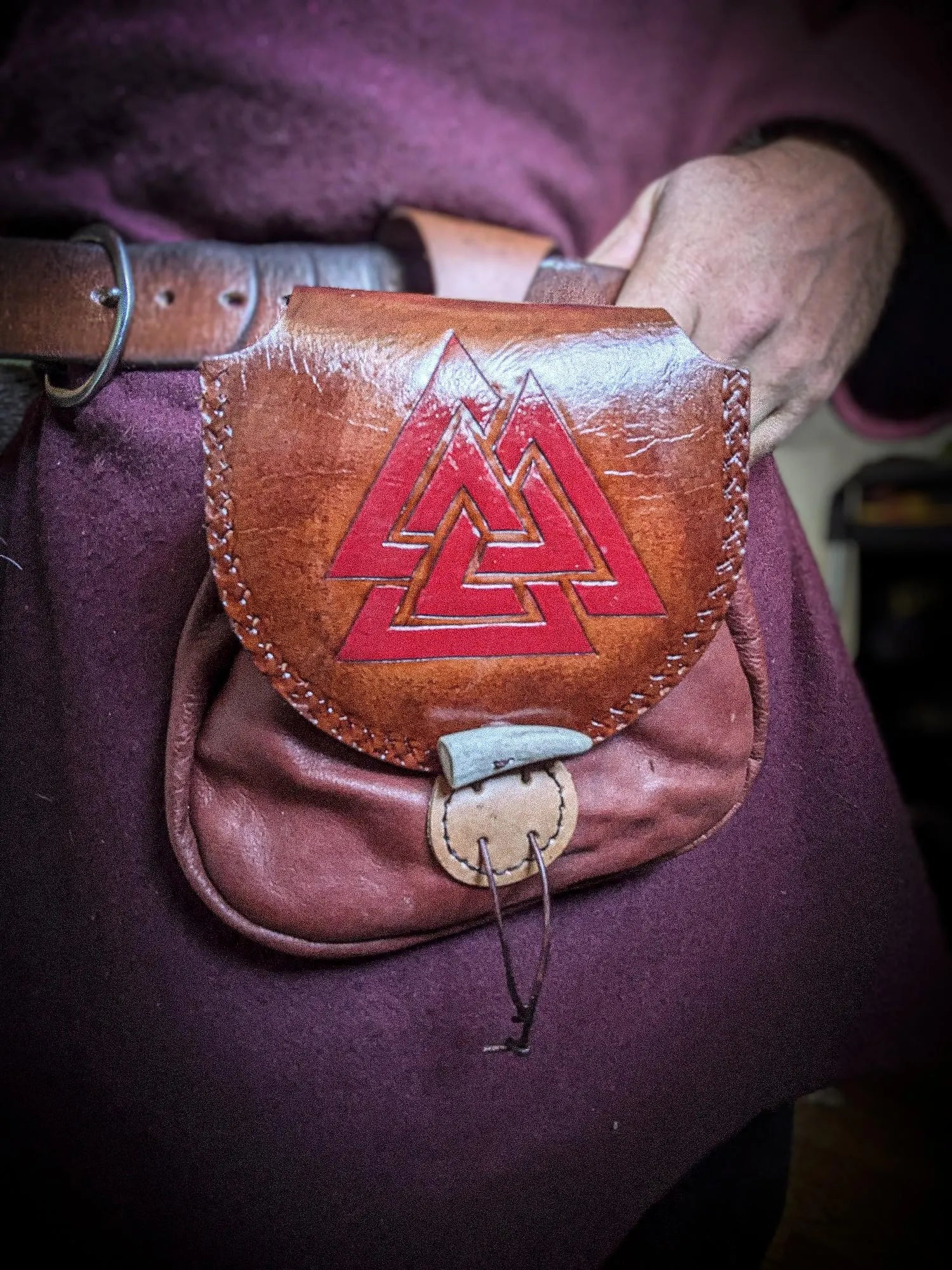 The lid of the bag is hand-carved and painted with the Valknut symbol from ancient Nordic runestones.